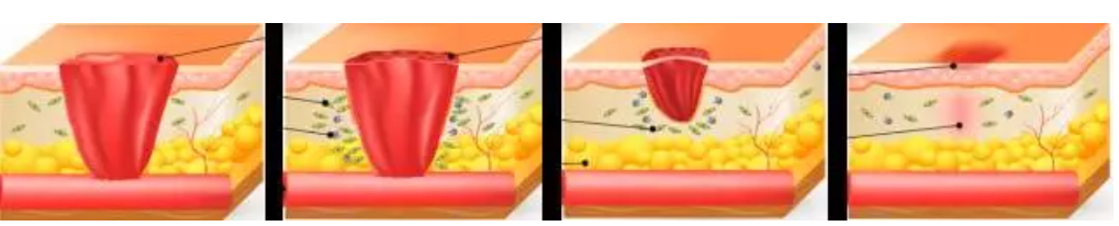 當皮膚受傷后,機體會有一系列的生化程序試圖進行修復。基本過程包括止血期,炎癥期,細胞增生期以及成熟及重塑期。